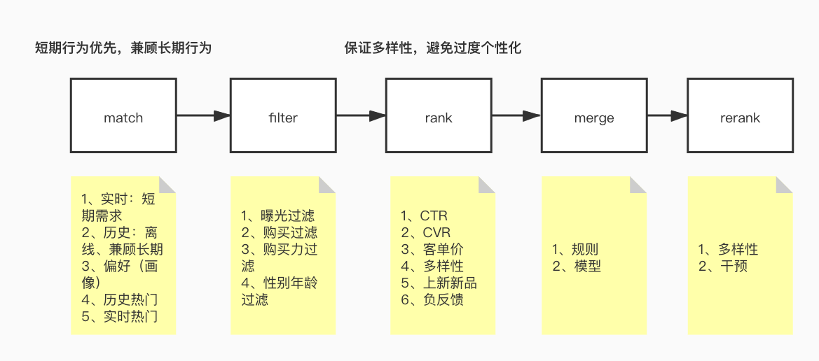 - 重点说下行为对于个性户召回的重要性:行为与兴趣具有重合度,是个性化精准推荐所有研究理论的基石。基于协同过滤、矩阵分解,与行为强相关。行为相关是上下文相关的长周期下的聚合与筛选,主要借助协同过滤、模型、专家系统等,依赖模型和数据的离线或近线处理
