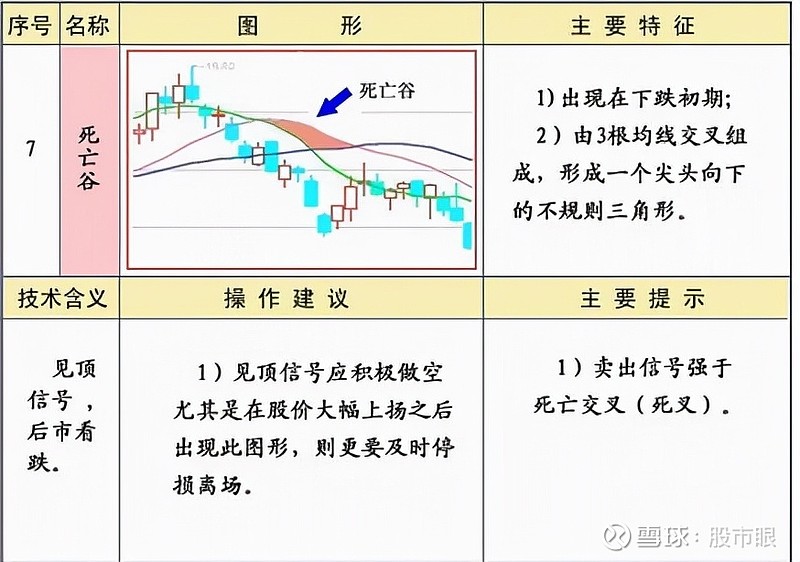 技术含义: 死亡谷 的出现,表明空方已积聚了相当大的杀跌能量,这是个典型的卖出信号。据资料统计,在股价前期涨幅较大的情况下出现 死亡谷 ,日后股价下跌和上涨的比例是8:2。而且一旦下跌,跌幅就很大。