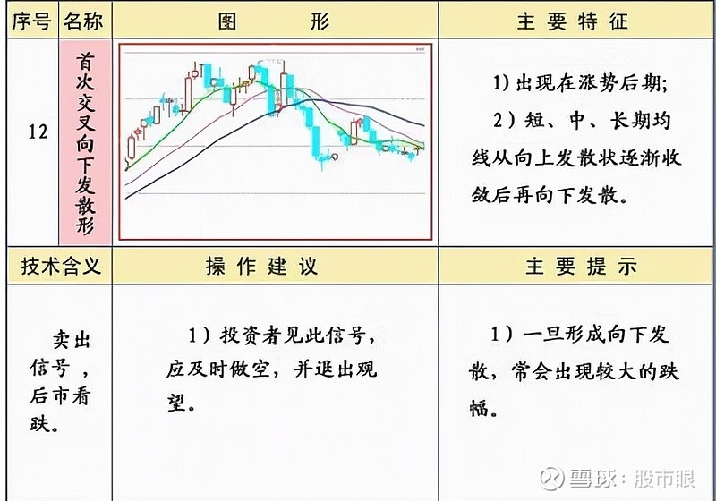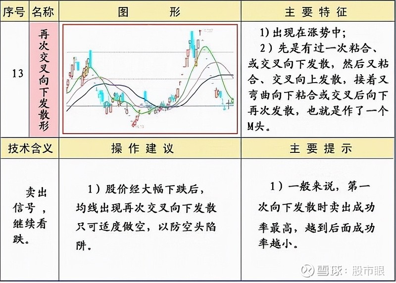 特征(技术含义):短期、中期、长期均线由下而上从散发到逐渐收敛,待完全收敛后再向下发散。 首次交叉向下发散形 和 均线粘合向下发散形 既有相同之处也有不同之处。相同之处:几根均线在某点位都出现了向下发散状;不同之处:前者的几根均线在向下发散前时处于分离收敛状,而后者的几根均线在向下发散前是处于粘合状态。两者的技术意义完全相同,都是卖出信号。
