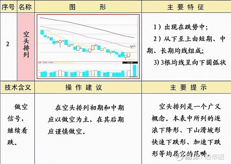 特征:在股市里,人们把几根移动平均线同时以圆弧状向下滑落,且长期移动平均线在上方,中期移动平均线在中间,短期移动平均线在下方的这种排列方式称之为:移动平均线空头排列。