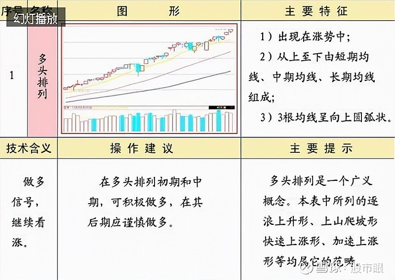 特征:均线多头排列是指短期移动平均线在上,中期移动平均线居中,长期移动平均线在下;几根移动平均线同时向上移动的一种排列方式。