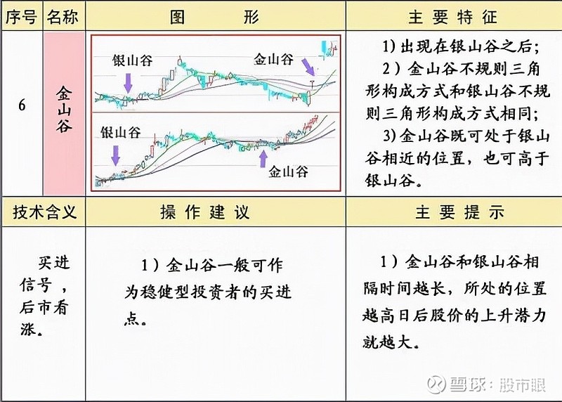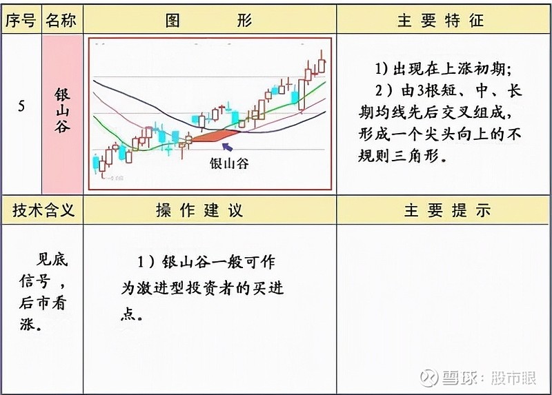特征:短中线都穿过长线时形成的图形,下边有一个三角,或者是四边形,这里象个山谷,长期下跌后首次出现的山谷,叫银山谷。