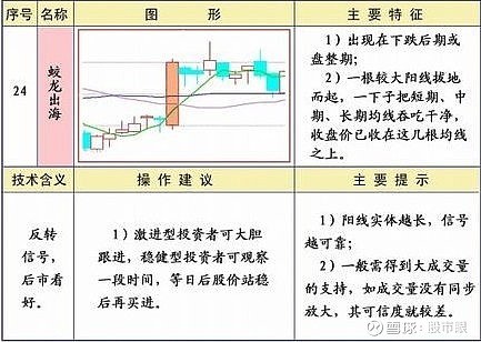 技术含义:蛟龙出海是个典型的上升信号,如成交量也随之放大,说明前期主力已经吸足筹码,现在要大刀阔斧往上拉抬了。