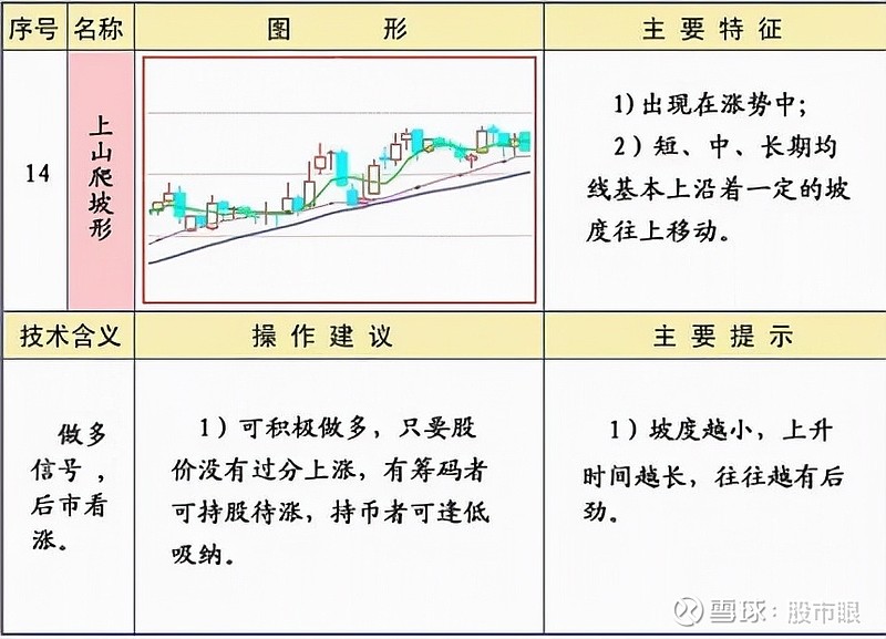 技术含义:均线形态出现上山爬坡形,表明股价将有一段持续的升势。一般来说,具有这种走势的个股上升潜力很大。
