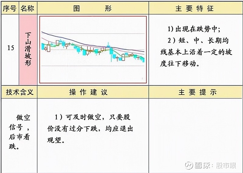 技术含义:均线出现下山滑坡形,表明股价将有一段持续的跌势。在股市中,这是最具杀伤力的图形之一。股价每天或每周跌幅并不大,但它持续不断地向下滑行,使人看不到它下跌的尽头在什么地方。