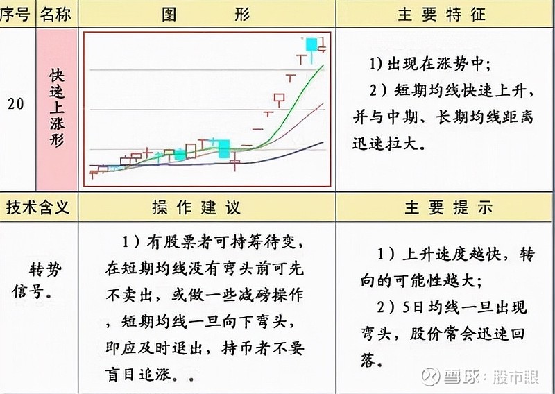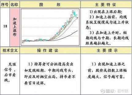 技术含义:加速上涨形是一种转势信号,它会引发股价急促掉头下行。因此投资者见此信号应保持警觉;持币的不应再盲目跟进;持股者要密切注意均线加速上涨时是否有K线见顶信号。
