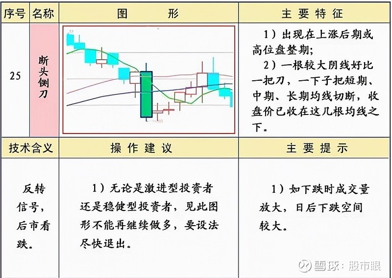 技术含义:技术上,断头铡刀是典型的做空信号,一般来说,大盘或个股在上升或盘整期间,只要出现断头铡刀,继续下跌的可能性就很大。有时它会引起一轮大的跌势。对多方造成很大的伤害。