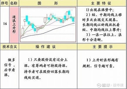 技术含义:均线出现逐浪上升形,表明股价整体呈上升趋势,并往往按进二退一的方式前进。空方只能小施拳脚(股价小幅回落),并无多大打击股价的能耐,多方始终占据着主动低位。