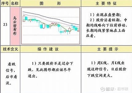 技术含义:技术上讲,均线出现乌云密布形,表明股价走势很弱,是个典型的卖出信号。因此投资者见此图形如有筹码,应及早出局。