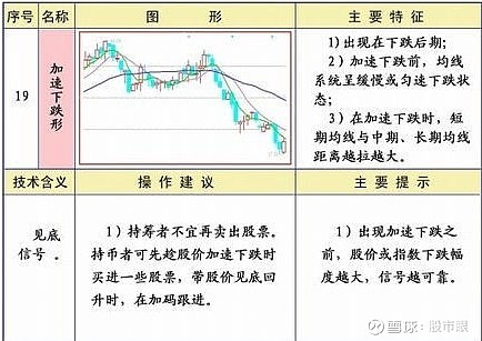 技术含义:从技术上来说,加速下跌形是一种止跌信号。它表示大盘或个股的下跌能量一下子得到较充分的释放,因而会出现止跌现象。