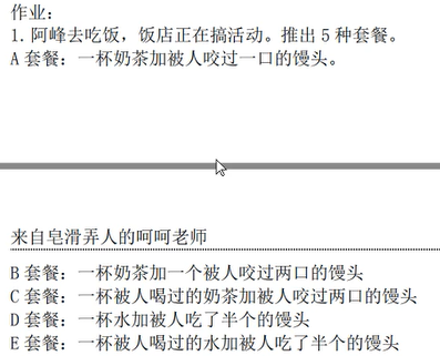 case "D":Console.WriteLine("一杯水加被人吃了半个的馒头");