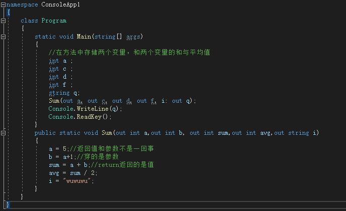 作用:一个函数中如果返回多个不同类型的值,就需要用到out参数。