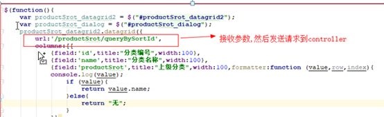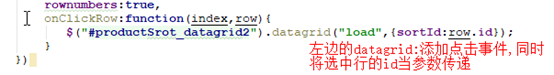 因此换了种方式,:在左边的datagrid中设置点击事件,在事件中,将选中行的id作为参数传给右边的datagrid,同时刷新右边datagrid,提交参数,右边的datagrid加载时,发送相关请求,查询数据,然后进行显示,代码如图所示: