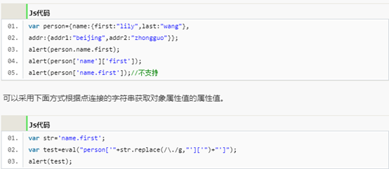 javascript语法为我们提供了两种方式获取一个对象的属性:点字符连接和[]方式。使用[]可以很方便的将一个属性通过字符串的方式获取。但是javascript并没有提供点连接的字符串属性访问方式,例如: