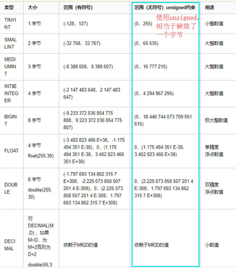 int[(m)][unsigned][zerofill] # tinyint 和 bigint 都是这种方法 整数,数据类型用于保存一些范围的整数数值范围: 有符号: -2147483648 ~ 2147483647 无符号: 0 ~ 4294967295 -