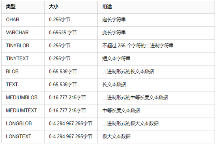 字符串类型指CHAR、VARCHAR、BINARY、VARBINARY、BLOB、TEXT、ENUM和SET。该节描述了这些类型如何工作以及如何在查询中使用这些类型。