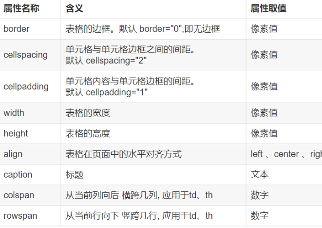 <!DOCTYPE html> <html lang="en"> <head> <meta charset="UTF-8"> <title>thead+tbody</title> </head> <body> <table cellspacing="2" cellpadding="10" align="center" border="1"> <thead> <tr> <th>属性名称</th> <th>含义</th> <th>取值</th> </tr> </thead> <tbody> <tr> <td>colspan</td> <td>向右横跨几列</td> <td>数值</td> </tr> <tr> <td>rowspan</td> <td>向下竖跨几行</td> <td>数值</td> </tr> </tbody> </table> </body> </html>