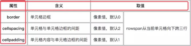 <!DOCTYPE html> <html lang="en"> <head> <meta charset="UTF-8"> <title>表头</title> </head> <body> <table border="1" cellspacing="1" cellpadding="10" align="center"> <caption>caption标签是啥?标题?</caption> <tr> <th>属性</th> <th>含义</th> <th colspan="2">取值</th> </tr> <tr> <th>border</th> <td>单元格边框</td> <td>像素值,默认0</td> <td rowspan="3">rowspan从当前单元格向下跨三行</td> </tr> <tr> <th>cellspacing</th> <td>单元格与单元格边框的间距</td> <td>像素值,默认2</td> </tr> <tr> <th>cellpadding</th> <td>单元格内容与单元格边框的间距</td> <td>像素值,默认1</td> </tr> </table> </body> </html>
