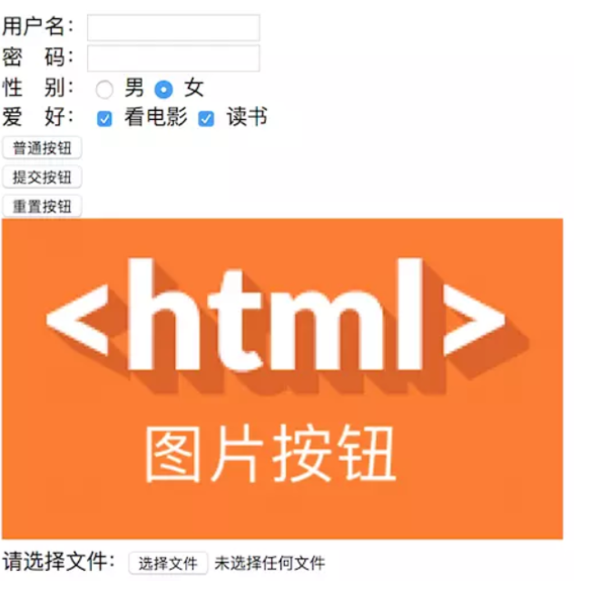 <!DOCTYPE html> <html lang="en"> <head> <meta charset="UTF-8"> <title>input标签</title> </head> <body> 用户名:<input type="text" maxlength="15"/> <br/> <!--次数密码中间的空格使用了是全角输入法,全角输入法中,空格占一个汉字的大小--> 密 码:<input type="password"/> <br/> <!--使用name 限定了一组内容,从而实现单选--> 性 别: <input type="radio" name="sex" checked="checked"/> 男 <input type="radio" name="sex"/> 女 <br/> 爱 好: <input type="checkbox" name="hobby"/> 看电影 <input type="checkbox" name="hobby"/> 读书 <br/> <input type="button" value="普通按钮"/> <br/> <input type="submit" value="提交按钮"/> <br/> <input type="reset" value="重置按钮"/> <br/> <input type="image" src="../image/imgButton.png"/> <br/> 请选择文件:<input type="file"/> </body> </html>