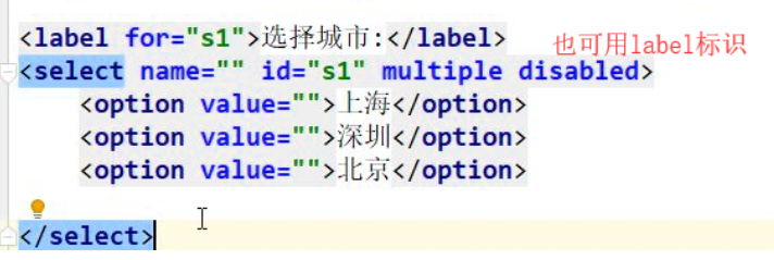 <form action="" method="post"> <select name="city" id="city"> <option value="1">北京</option> <option selected="selected" value="2">上海</option> #默认选中,当属性和值相同时,可以简写一个selected就行了 <option value="3">广州</option> <option value="4">深圳</option> </select> </form> #参数说明: multiple:布尔属性,设置后为多选下拉框,否则默认单选 disabled:禁用,文本框都可用禁用 selected:默认选中该项 value:定义提交时的选项值