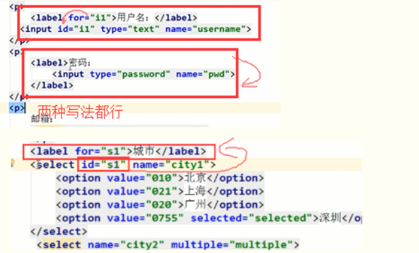 <form action=""> <label for="username">用户名</label> #for和input的id属性一样,就关联在一起了 <input type="text" id="username" name="username"> </form>