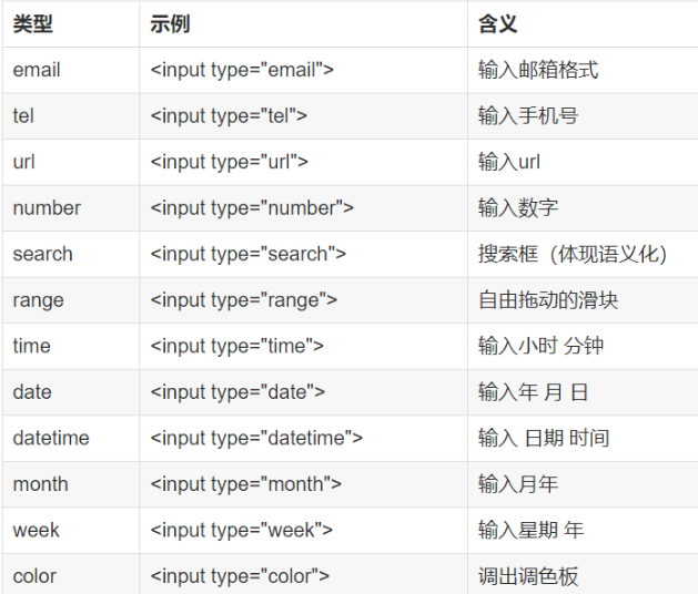 <!DOCTYPE html> <html lang="en"> <head> <meta charset="UTF-8"> <title>newInputType</title> </head> <body> <form action="http://www.baidu.com"> email:<input type="email"/> <br/> tel:<input type="tel"/> <br/> url:<input type="url"/> <br/> number:<input type="number"/> <br/> search:<input type="search"/> <br/> range:<input type="range"/> <br/> time:<input type="time"/> <br/> date:<input type="date"/> <br/> datetime:<input type="datetime-local"/> <br/> month:<input type="month"/> <br/> week:<input type="week"/> <br/> color:<input type="color"/> <br/> <input type="submit"/> </form> </body> </html>