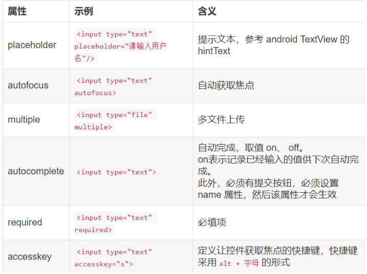 <!DOCTYPE html> <html lang="en"> <head> <meta charset="UTF-8"> <title>newInputAttr</title> </head> <body> <form action="form.html"> <input type="text" placeholder="请输入用户名"/> <br/> <br/> <!--可以简化为 <input type="text" autofocus/> --> <input type="text" autofocus="autofocus" placeholder="自动获取焦点"/> <br/> <br/> <input type="file" multiple/> <br/> <br/> <input type="text" autocomplete name="identify" placeholder="下次自动补足输入内容"/> <br/> <br/> <!--在火狐浏览器中,如果没有输入内容,点击输入框外部区域,边框会变红--> <input type="text" required placeholder="这是必填项"/> <br/> <br/> <input type="text" accesskey="s" placeholder="获取焦点的快捷键为 alt+s"/> <br/> <br/> <input type="submit"/> </form> </body> </html>
