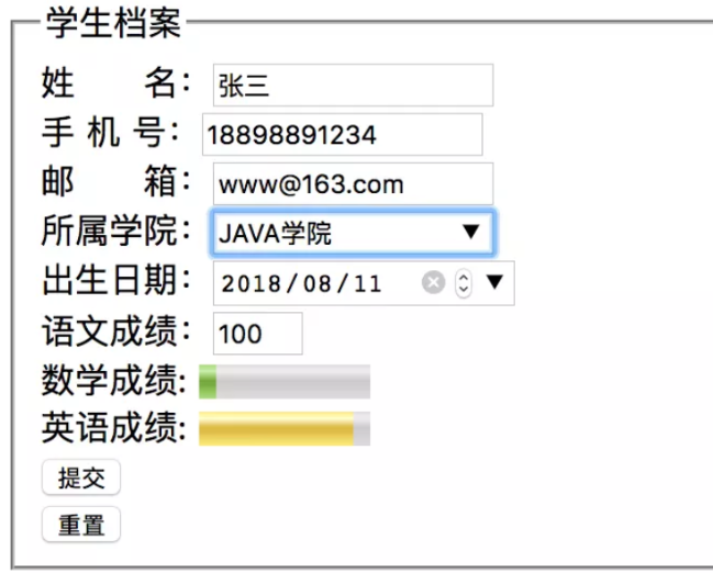 <!DOCTYPE html> <html lang="en"> <head> <meta charset="UTF-8"> <title>test1</title> </head> <body> <form action=""> <fieldset> <legend>学生档案</legend> <label>姓 名:<input type="text" placeholder="请输入学生姓名"/></label> <br/> <label>手 机 号:<input type="tel" placeholder="请输入学生手机号"/></label><br/> <label>邮 箱:<input type="email"/></label><br/> <label>所属学院:<input type="text" list="academy"/></label> <datalist id="academy"> <option >JAVA学院</option> <option >前端学院</option> <option >PHP学院</option> </datalist><br/> <label>出生日期:<input type="date"/></label><br/> <label>语文成绩:<input type="number" max="100" min="0" value="0"/></label><br/> <label>数学成绩: <meter max="100" min="0" low="59" value="10"></meter></label><br/> <label>英语成绩: <meter max="100" min="0" low="59" value="90"></meter></label><br/> # low表示过了就变颜色 <input type="submit"><br/> <input type="reset"> </fieldset> </form> </body> </html>