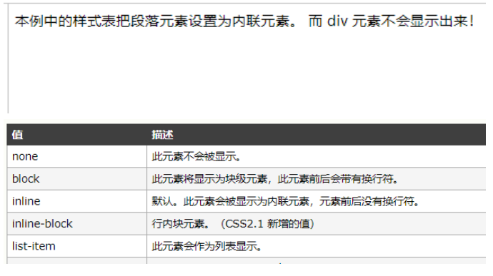 <head> <style type="text/css"> p {display: inline} div {display: none} </style> </head> <body> <p>本例中的样式表把段落元素设置为内联元素。</p> <p>而 div 元素不会显示出来!</p> <div>div 元素的内容不会显示出来!</div> </body>