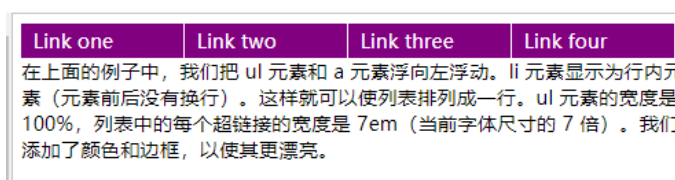 在上面的例子中,我们把 ul 元素和 a 元素浮向左浮动。li 元素显示为行内元素(元素前后没有换行)。这样就可以使列表排列成一行。ul 元素的宽度是 100%,列表中的每个超链接的宽度是 7em(当前字体尺寸的 7 倍)。我们添加了颜色和边框,以使其更漂亮。