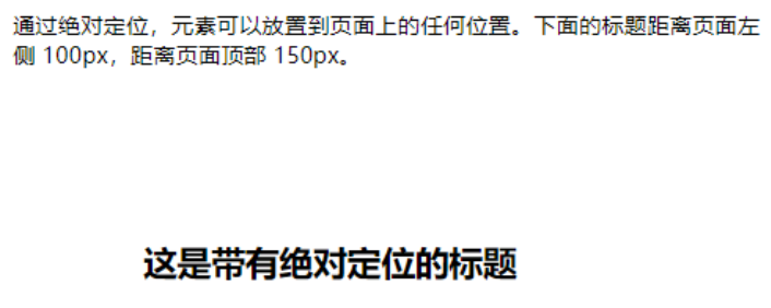 <head> <style type="text/css"> h2.pos_abs { position:absolute; left:100px; top:150px } </style> </head> <body> <h2 class="pos_abs">这是带有绝对定位的标题</h2> <p>通过绝对定位,元素可以放置到页面上的任何位置。下面的标题距离页面左侧 100px,距离页面顶部 150px。</p> </body>