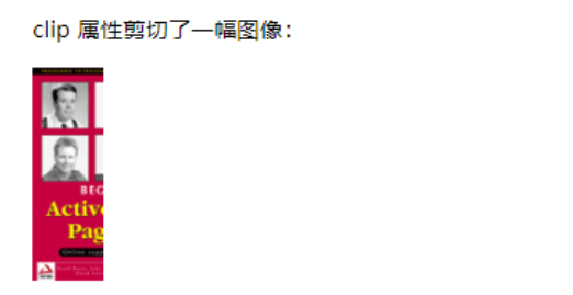 <head> <style type="text/css"> img { position:absolute; clip:rect(0px 50px 200px 0px) } </style> </head> <body> <p>clip 属性剪切了一幅图像:</p> <p><img border="0" src="/i/eg_bookasp.gif" width="120" height="151"></p> </body>