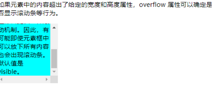 <head> <style type="text/css"> div { background-color:#00FFFF; width:150px; height:150px; overflow: scroll; } </style> </head> <body> <p>如果元素中的内容超出了给定的宽度和高度属性,overflow 属性可以确定是否显示滚动条等行为。</p> <div> 这个属性定义溢出元素内容区的内容会如何处理。如果值为 scroll,不论是否需要,用户代理都会提供一种滚动机制。因此,有可能即使元素框中可以放下所有内容也会出现滚动条。默认值是 visible。 </div> </body>