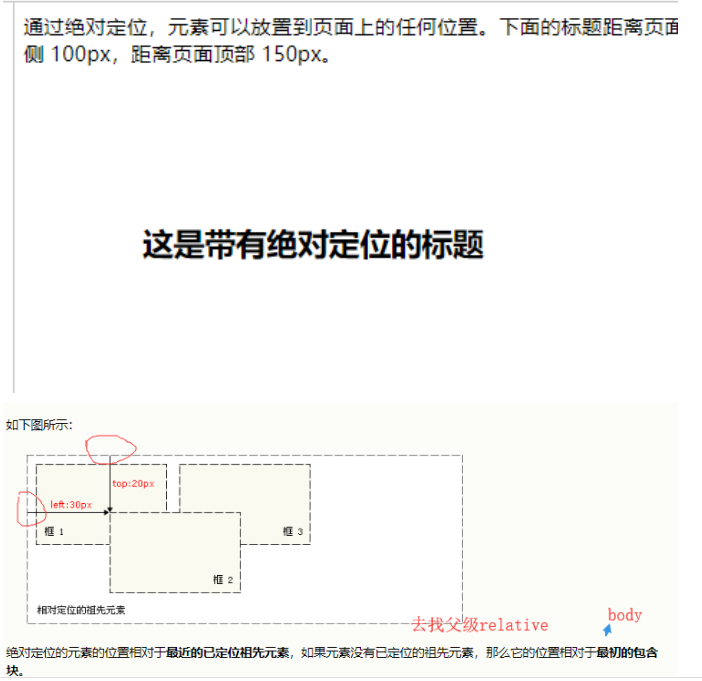 #box_relative { position: absolute; left: 30px; top: 20px; } #实列 <head> <style type="text/css"> h2.pos_abs { position:absolute; left:100px; top:150px } </style> </head> <body> <h2 class="pos_abs">这是带有绝对定位的标题</h2> <p>通过绝对定位,元素可以放置到页面上的任何位置。下面的标题距离页面左侧 100px,距离页面顶部 150px。</p> </body>