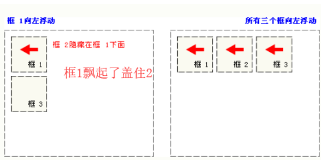 再请看下图,当框 1 向左浮动时,它脱离文档流并且向左移动,直到它的左边缘碰到包含框的左边缘。因为它不再处于文档流中,所以它不占据空间,实际上覆盖住了框 2,使框 2 从视图中消失。