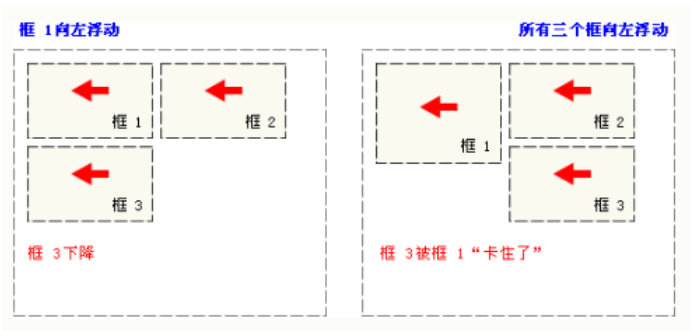 如下图所示,如果包含框太窄,无法容纳水平排列的三个浮动元素,那么其它浮动块向下移动,直到有足够的空间。如果浮动元素的高度不同,那么当它们向下移动时可能被其它浮动元素“卡住”: