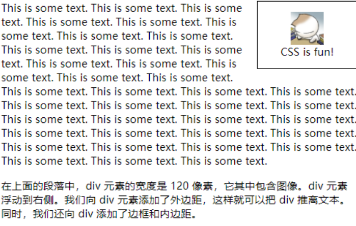 <head> <style type="text/css"> div { float:right; width:120px; margin:0 0 15px 20px; padding:15px; border:1px solid black; text-align:center; } </style> </head> <body> <div> <img src="/i/eg_cute.gif" /><br /> CSS is fun! </div> <p> This is some text. This is some text. This is some text. This is some text. This is some text. This is some text. This is some text. This is some text. This is some text. This is some text. This is some text. This is some text. This is some text. This is some text. This is some text. This is some text. This is some text. This is some text. This is some text. This is some text. This is some text. This is some text. This is some text. This is some text. This is some text. This is some text. This is some text. This is some text. This is some text. This is some text. This is some text. This is some text. This is some text. This is some text. This is some text. This is some text. This is some text. This is some text. This is some text. </p> <p> 在上面的段落中,div 元素的宽度是 120 像素,它其中包含图像。div 元素浮动到右侧。我们向 div 元素添加了外边距,这样就可以把 div 推离文本。同时,我们还向 div 添加了边框和内边距。 </p> </body> </html>