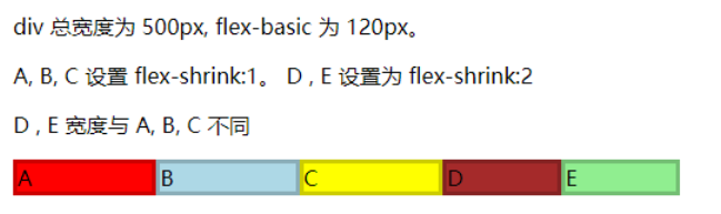 <style> #content { display: flex; width: 500px; } #content div { flex-basis: 120px; border: 3px solid rgba(0,0,0,.2); } .box { flex-shrink: 1; } .box1 { flex-shrink: 2; } </style> </head> <body> <p>div 总宽度为 500px, flex-basic 为 120px。</p> <p>A, B, C 设置 flex-shrink:1。 D , E 设置为 flex-shrink:2</p> <p>D , E 宽度与 A, B, C 不同</p> <div id="content"> <div class="box" style="background-color:red;">A</div> <div class="box" style="background-color:lightblue;">B</div> <div class="box" style="background-color:yellow;">C</div> <div class="box1" style="background-color:brown;">D</div> <div class="box1" style="background-color:lightgreen;">E</div> </div>