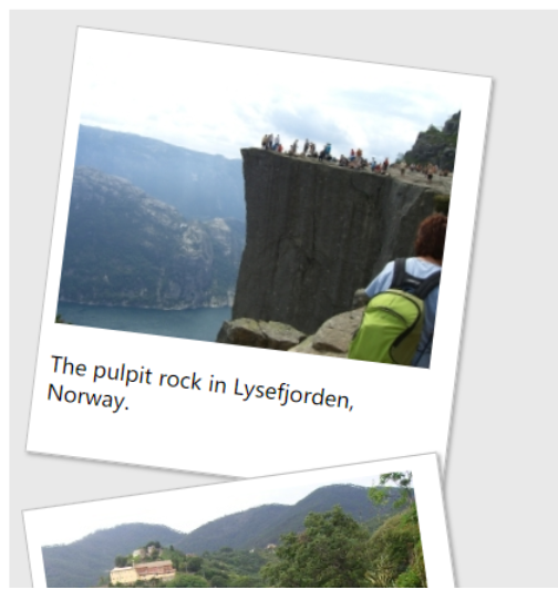 <style> body { margin:30px; background-color:#E9E9E9; } div.polaroid { width:294px; padding:10px 10px 20px 10px; border:1px solid #BFBFBF; background-color:white; /* Add box-shadow */ box-shadow:10px 3px 3px #aaaaaa; } div.rotate_left { float:left; -ms-transform:rotate(7deg); /* IE 9 */ -webkit-transform:rotate(7deg); /* Safari and Chrome */ transform:rotate(7deg); } div.rotate_right { float:left; -ms-transform:rotate(-8deg); /* IE 9 */ -webkit-transform:rotate(-8deg); /* Safari and Chrome */ transform:rotate(-8deg); } </style> </head> <body> <div class="polaroid rotate_left"> <img src="pulpitrock.jpg" alt="" width="284" height="213"> <p class="caption">The pulpit rock in Lysefjorden, Norway.</p> </div> <div class="polaroid rotate_right"> <img src="cinqueterre.jpg" alt="" width="284" height="213"> <p class="caption">Monterosso al Mare. One of the five villages in Cinque Terre.</p> </div> </body>
