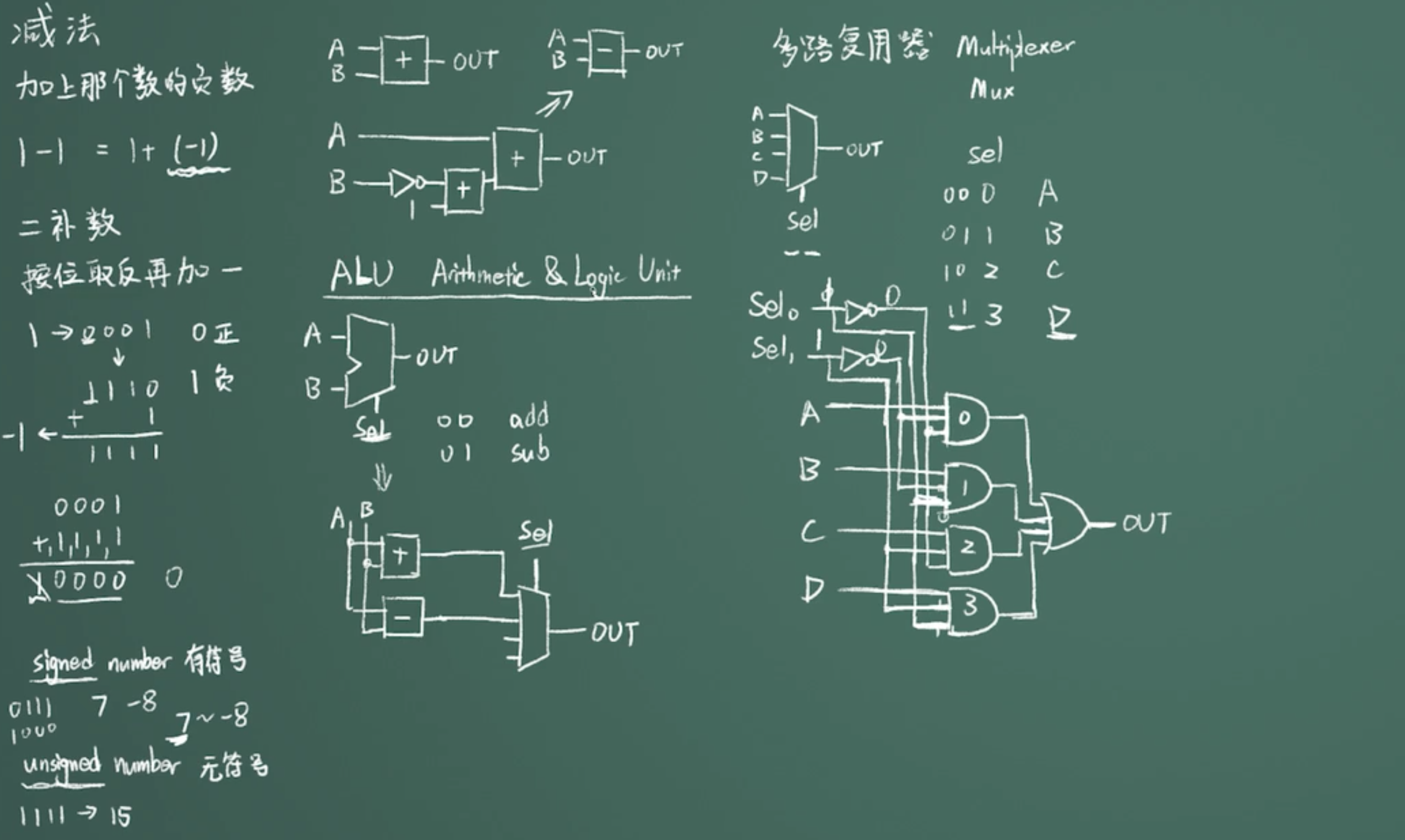 减法的实现:我们知道减去一个数就是加上这个数的负数,如:1-1=1+(-1); 计算机中为了实现这个效果使用了一个新概念:二补数,用来表达一个数的负数。