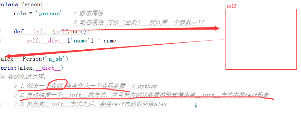 class Person: role = 'person' #静态属性 def __init__(self): print(self) #查看变量 alex = Person() #会把alex自己传给()里 print(alex) #查看变量 执行输出: <__main__.Person object at 0x0000025F23D8BC18> <__main__.Person object at 0x0000025F23D8BC18> 可以看到2次查看变量的内存地址是一样的。 也就是说self表示实例本身。 #如果实例化时,传入一个参数 alex = Person('sb') # TypeError 因为传的参数是多余的,为什么呢?在没传参之前,执行正常,传参之后,就报错了。 因为实例化时,它把实例本身传给类,self接收了参数,也就是实例本身。再多传一个参数,就报错了 #类里面再多写一个参数,实例化时,传一个参数 class Person: role = 'person' #静态属性 def __init__(self,name): print(self,name) #查看变量 alex = Person('sb') print(alex) #查看变量 执行输出: <__main__.Person object at 0x00000243EC48B908> sb <__main__.Person object at 0x00000243EC48B908> #name和self是没有关系的 查看self的值 class Person: role = 'person' #静态属性 def __init__(self,name): print(self.__dict__) #查看变量 alex = Person('sb') # {}self默认有一个空字典 # 可以给self传参数 class Person: role = 'person' #静态属性 def __init__(self,name): self.__dict__['name'] = name alex = Person('sb') print(alex.__dict__) # {'name': 'sb'}