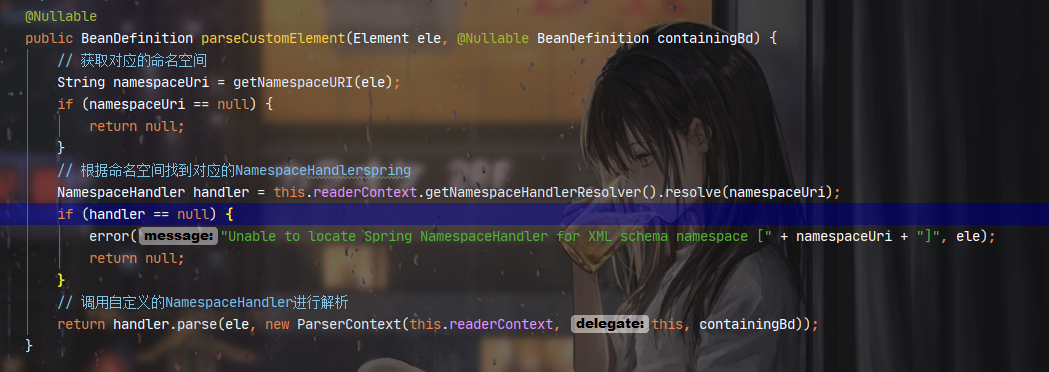 4)如果标签非beans.xsd下的将走delegate.parseCustomElement,调用getNamespaceHandlerResolver().resolve(),自动扫描所有的META-INF/spring.handlers,并匹配到合适的NamespaceHandler