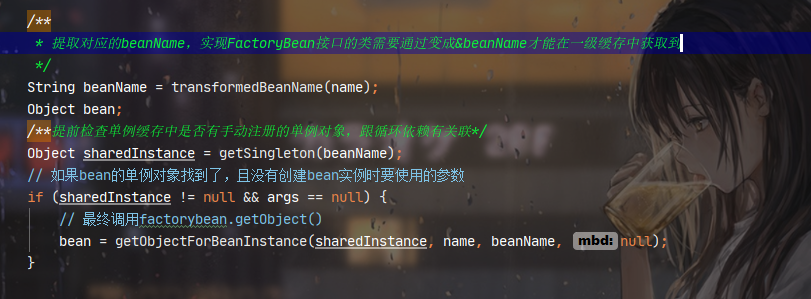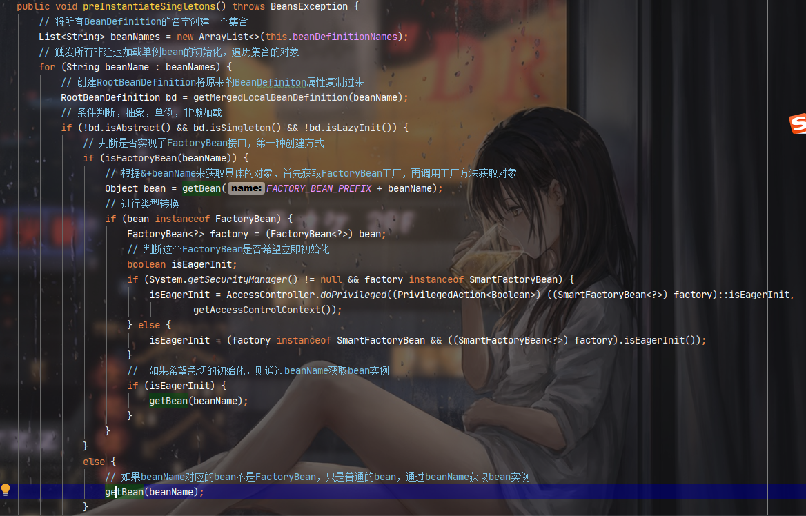 通过全面学习知道了BeanDefinition对象已经创建好了,spring内置对象也创建好了,现在调用beanFactory.preInstantiateSingletons()开始创建对象,循环遍历BeanDefinition,判断当前是否是继承FactoryBean的类,如果是优先创建工厂对象,再判断是否急需创建工厂类中的方法创建子类