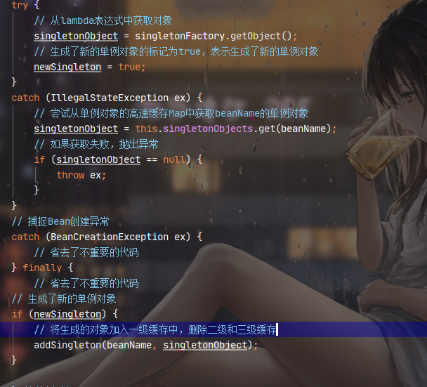 如果缓存中,则调用lambda表达式createBean-》doCreateBean 并调用addSingleton()将返会的对象放入一级缓存中,删除二级和三级缓存
