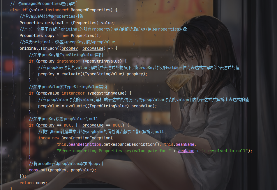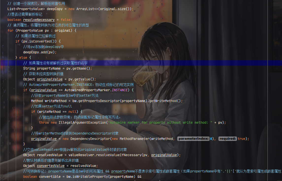 执行populateBean()方法,从BeanDefinition中获取PropertyValues,所有的成员变量存放在里面,对PropertyValues复制副本,进行解析,类型转换