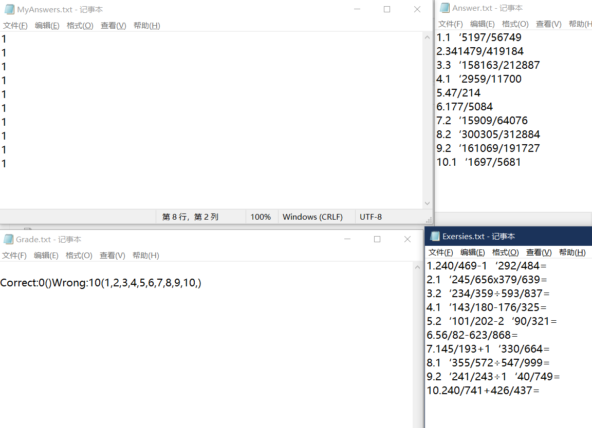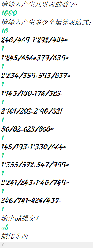 有些遗憾的是运算符个数只实现了单个运算符,查重功能也尚未实现,一万道题的功能虽然可以实现,但是键入一万个答案的过程过于繁琐,或许以后有能力了能够改进吧。