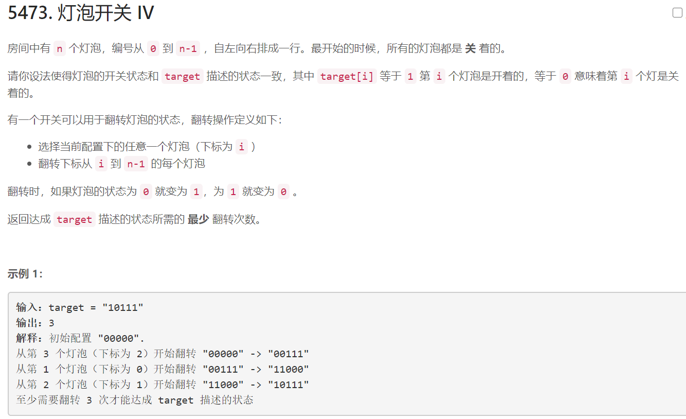 题目链接:https://leetcode-cn.com/contest/weekly-contest-199/problems/bulb-switcher-iv/