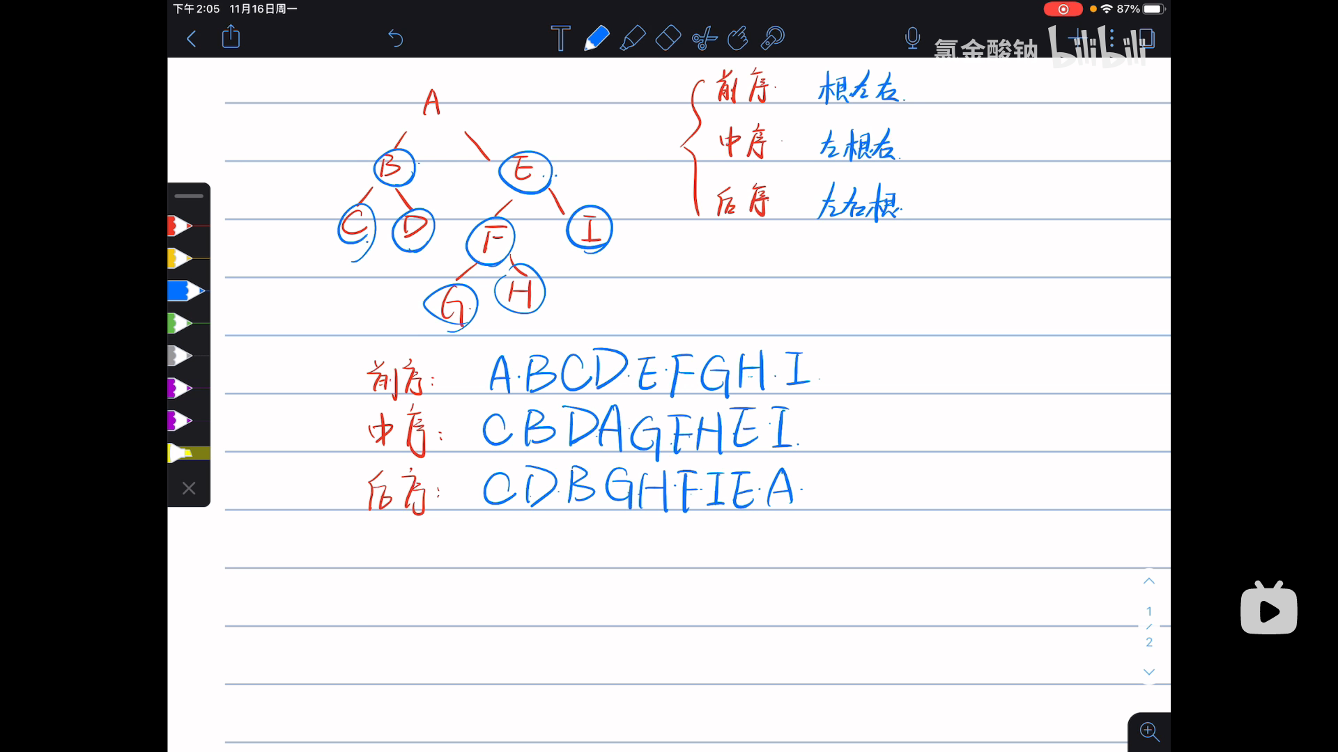 一个叶子节点了(C),再回溯到B,然后执行下面的右节点遍历,遍历到D。然后再回溯到A,执行右遍历,一样的思路。