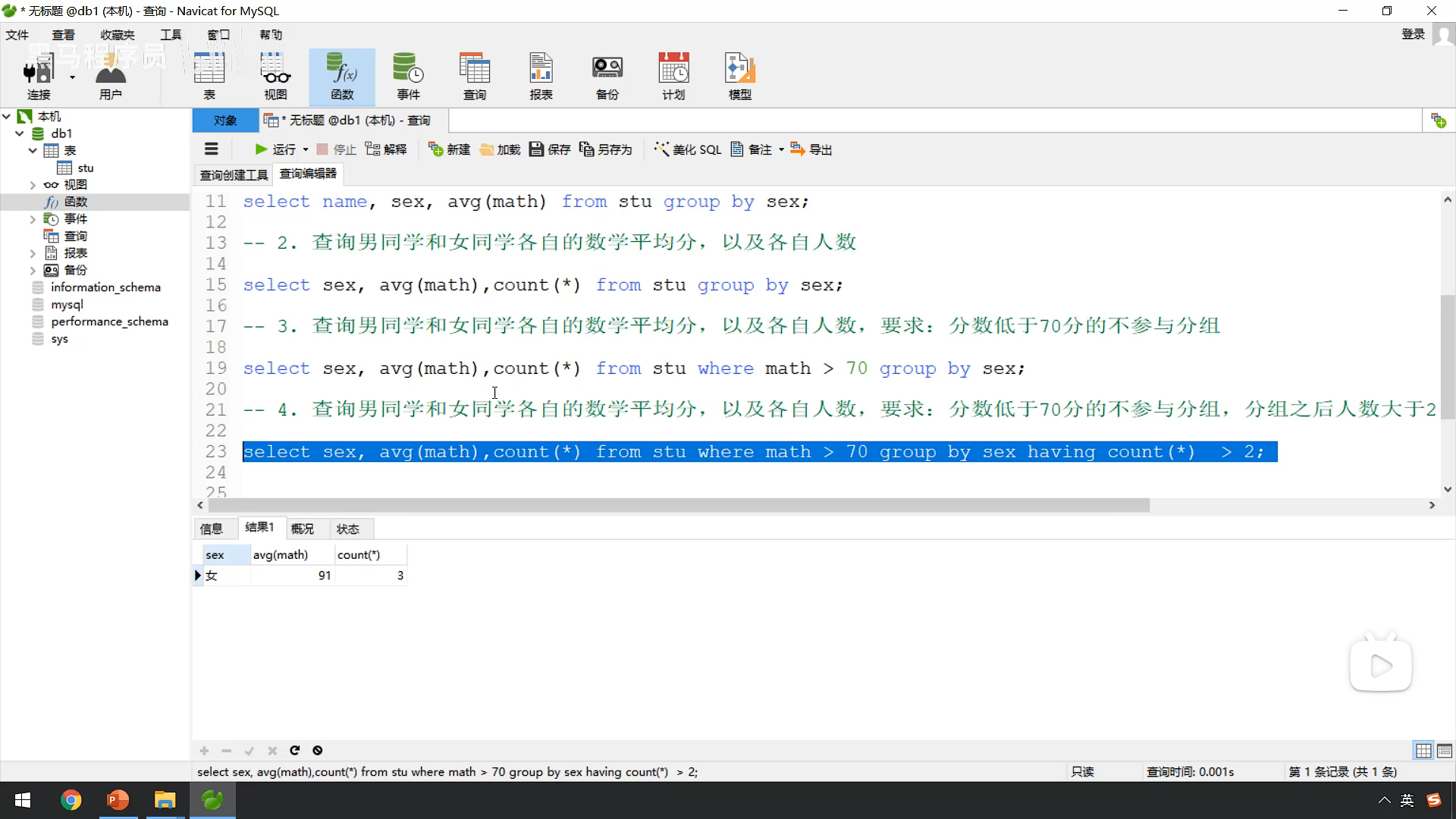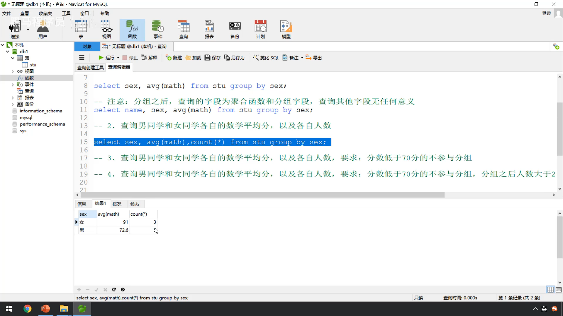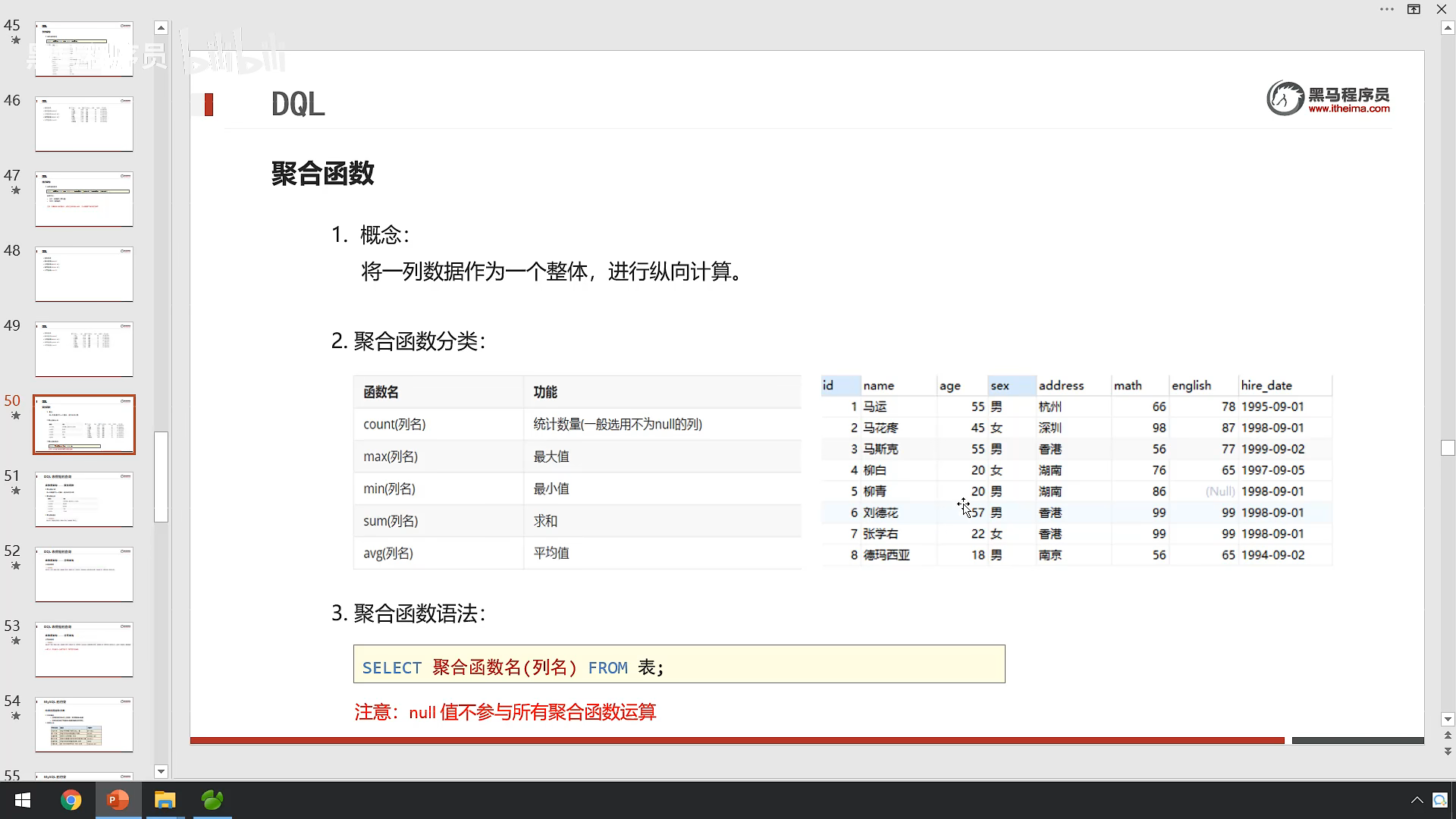 聚合函数:(null不参与聚合函数的运算,比如count,就不会统计数值为null的那一行。再比如max,也不会把null算进去)