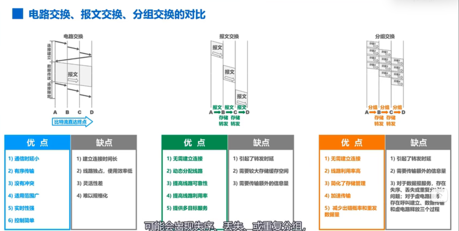 缺点:效率低(如果传输数据时候,用户所占用的通信资源没有利用,就白白浪费了)